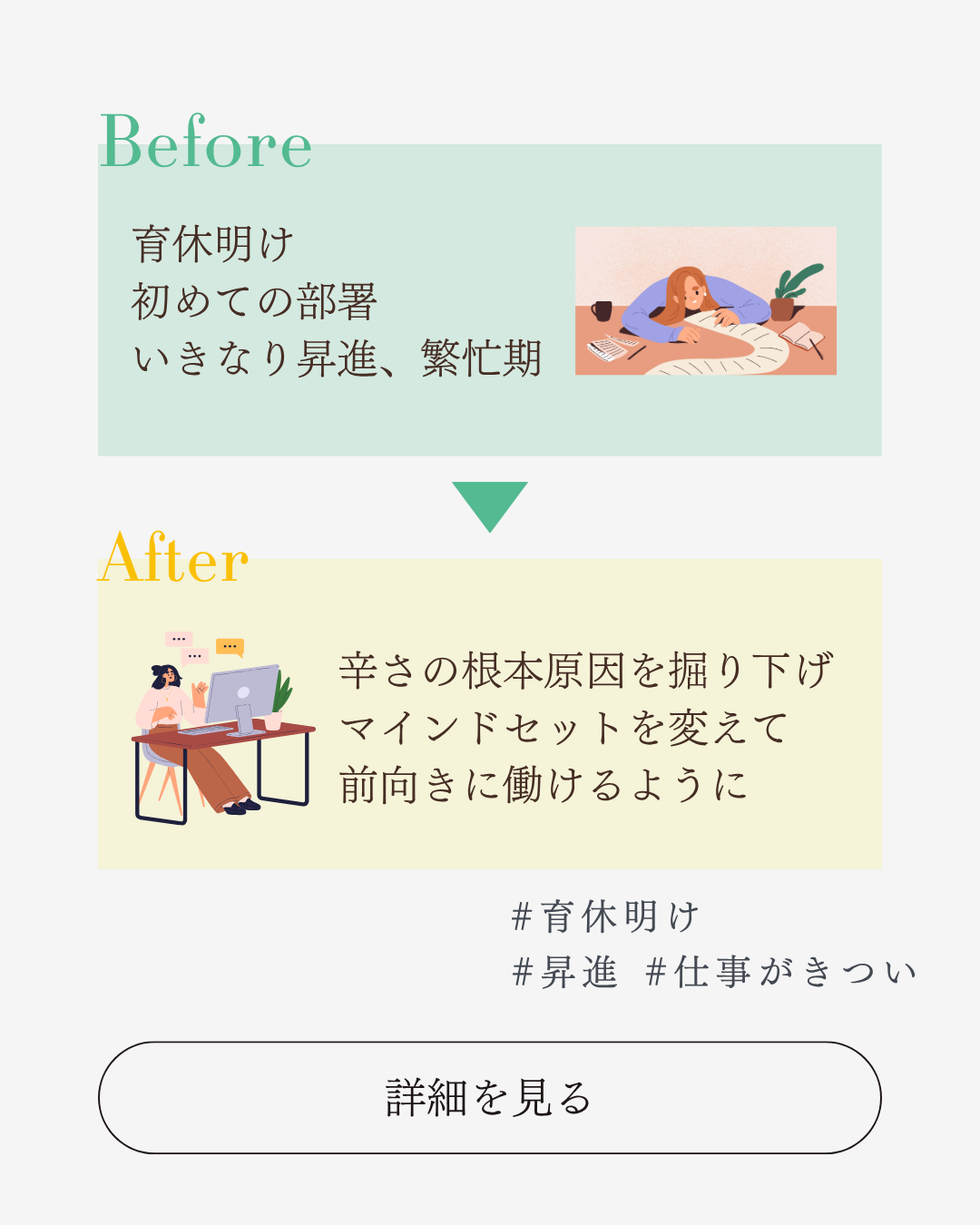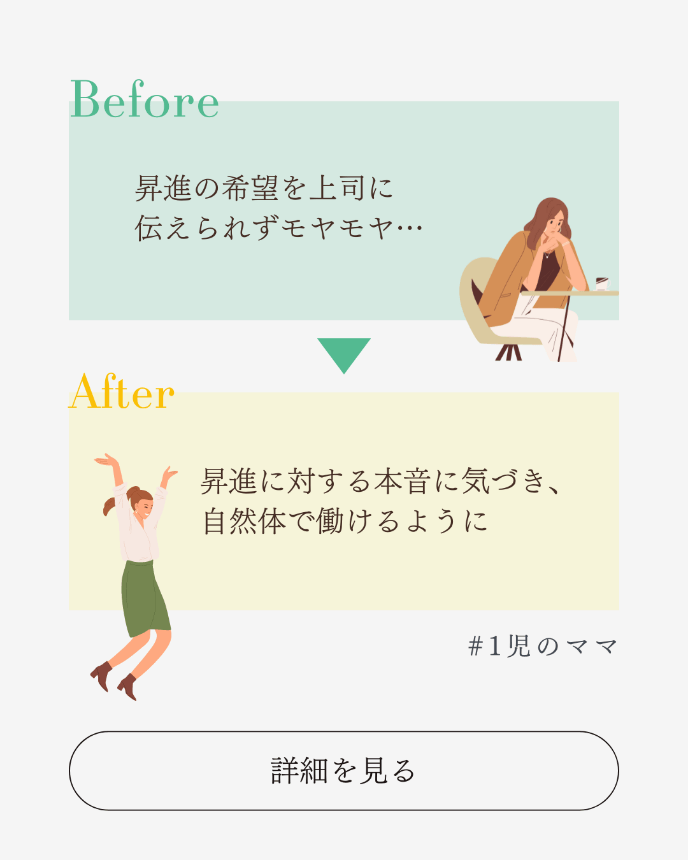 仕事、母、妻、娘。様々な役割を果たす中での葛藤に苦しむワーママには、今すでに自身に宿っている強さを損じて大切に育んでほしい。そんな思いでコーチングを提供している。